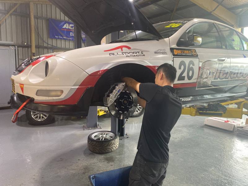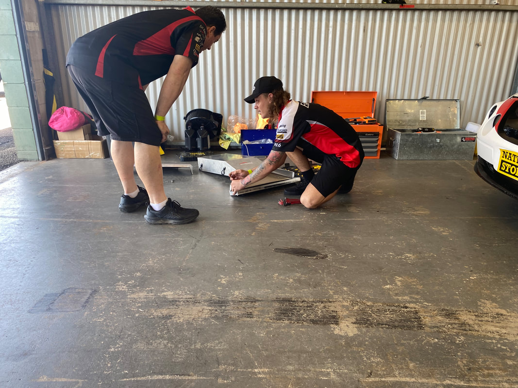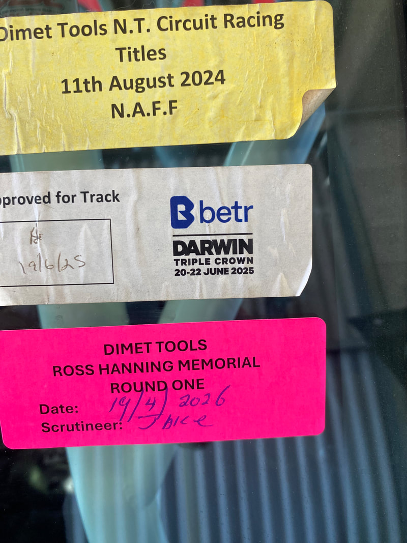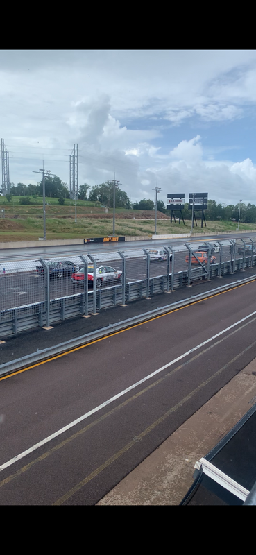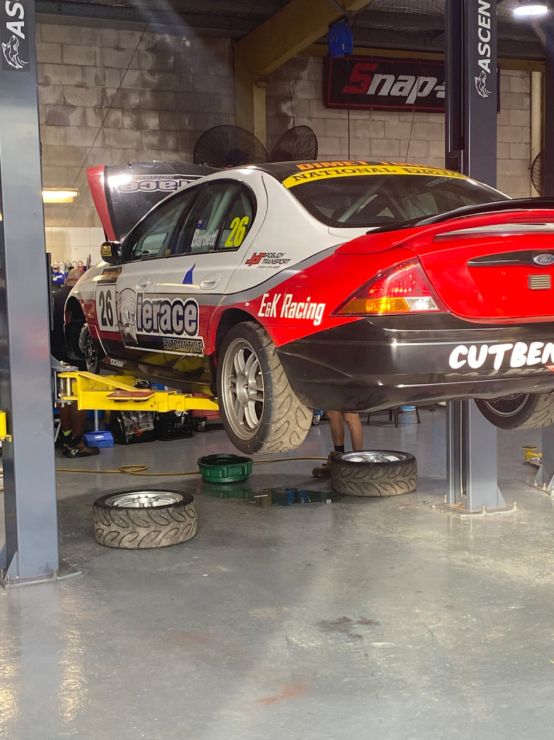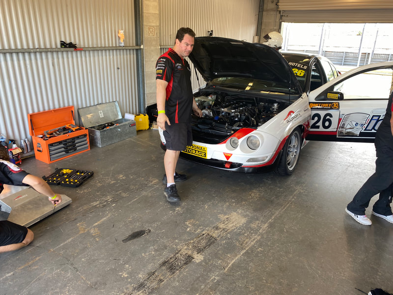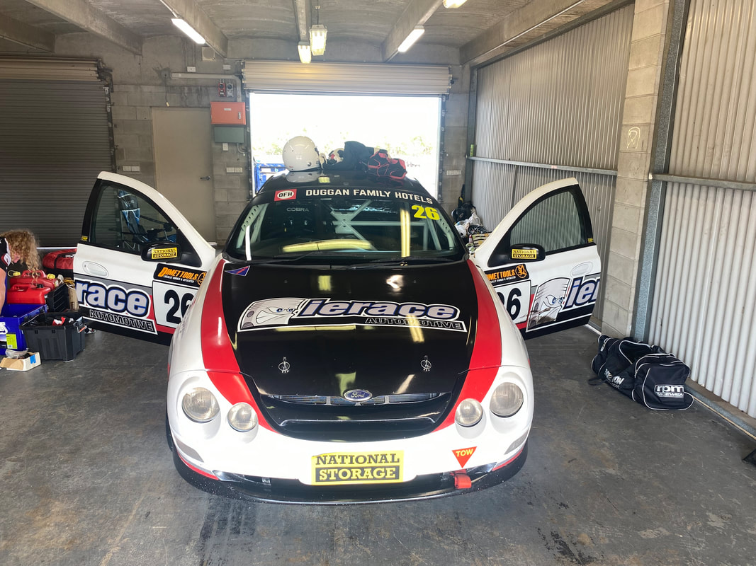 Race 1 had similar issues to qualifying with speed hard to find and lacking confidence in the handling resulted in less than optimum race times. Despite the issues with the AU XR8 gear box and brakes, we were able to nurse the car through the first race and gain a few positions. Rachel Beers and her VE Commodore retired on lap two with electrical issues and Ross Salmon in his VY Club Sport lost it's usual pace from lap five with a fuel issue. We managed to keep our average lap times up and pulled the AU falcon past Ross Salmon on lap seven and finished the race in second place for some more points behind Stephen Johnstone who kept his Commodore up front with 1:19 lap times. Race 2 we were seeing some improvements with the brakes and reduced levels of vibration along with the new larger radiator proving its value with coolant temperatures holding well at 90 degrees despite the warmer track temperatures. Stephen Johnstone again in his Commodore led the way and Ross Salmon in his Club Sport keeping pace until a tyre failure on lap four ended his race. Our AU XR8 again coming home second for some further valuable points. Race 3 saw the Darwin weather play it's part with consistent light rain through the race, making the conditions tricky and traction difficult to find. Despite this and the ongoing gear box issues which limited speed on the straight, we had some good handling in the wet with our running times being better or at least equivalent to the front running Commodore Cup cars and within two seconds of other Improved Production cars. The AU XR8 finished the race in third with the lap times looking more respectable. Race 4 was the final all in race with Improved production, Commodore Cup, HQ Holdens and Excel cars all on the one grid. Prior to the race we discovered a failure in the exhaust mounting, Dane and Clayton in very limited time went to work manufacturing a new rear bracket to the side exhaust. Fortunately, we carried flat aluminium bar and fabrication tools in our mobile workshop to enable the work being undertaken. The value of having two quality mechanics committed to getting the car on track resulted in us making the grid in what was looking to be our first mechanical withdrawal for the season. After 10 laps we finished the race second in class to Stephen Johnson securing some further valuable points for the season and despite the lacking 5th gear, we had our XR8 circulating with times only three seconds off of the winning cars best for the race. Final round results for the weekends racing are yet to be announced by NAMSC. Our provisional calculation for points had our AU XR8 finishing second, behind Stephen Johnstones Commodore, with Ross Salmons Club Sport coming in third. |
